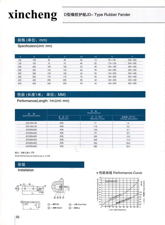 設(shè)計壓縮變形大(在反力不增加的情況下),比V型提高20%,比M型提高8%,從而使制品吸能量大幅度增加;2,在壓縮型護舷系列中,拱型護舷(TD-B)單位重量(耗橡膠)吸能量高;3,錨固性好,適用于船舶,碼頭,船塢等,應(yīng)用范圍廣;