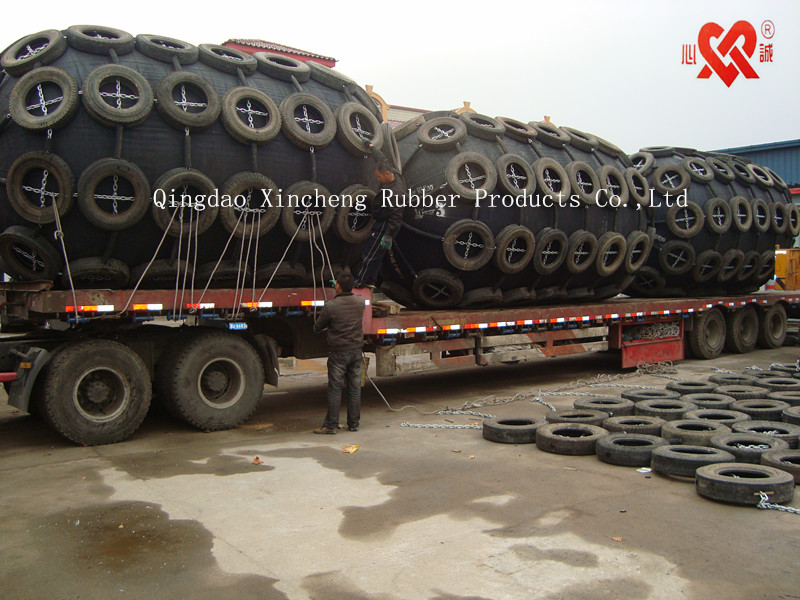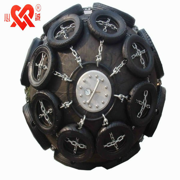 護套式充氣橡膠護舷(靠球)是“依據(jù)ISO17357(Net Type Pneumatic Fenders)開發(fā)生產(chǎn)的一種具有高強度、高耐磨性的護舷系統(tǒng)。尺寸為:D1.0m x L1.5 ~ D3.3m x L6.5m。其突出的外觀特點就是:充氣護舷的本體外由一張輪胎鏈條網(wǎng)包裹,從而延長了護舷本體的使用壽命。所使用輪胎全部經(jīng)過特殊處理,使表面美觀;其鏈條全部經(jīng)過熱鍍鋅處理。